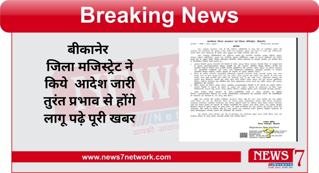 NEWS 7 NETWORK श्रीडूंगरगढ़। भारत पाक सीमा पर तनाव को देखते हुए जिला प्रशासन द्वारा एडवाइजरी जारी की गई है और यह एडवाइजरी तुरंत प्रभाव से लागू होगी बीकानेर जिला मजिस्ट्रेट जिला कलेक्टर नम्रता वृष्णी द्वारा आदेश जारी कर दिए गए हैं जो आमजन पूरी तरह से इन नियमों का पालन करें ।