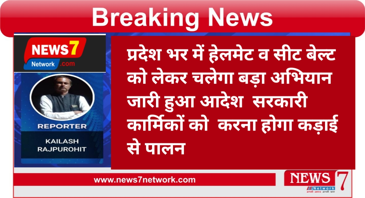 न्यूज 7 नेटवर्क ब्यूरो जयपुर। प्रदेश में हो रही बड़ी सड़क दुर्घटनाओं को देखते हुए अब यातायात नियमों का उल्लंघन करने वालों के खिलाफ कड़ा एक्शन होगा। पुलिस मुख्यालय से इसको लेकर आदेश जारी कर दिए गए हैं जिसमें सीट बेल्ट व हेलमेट को अनिवार्य रूप से लागू कर दिया गया है ।